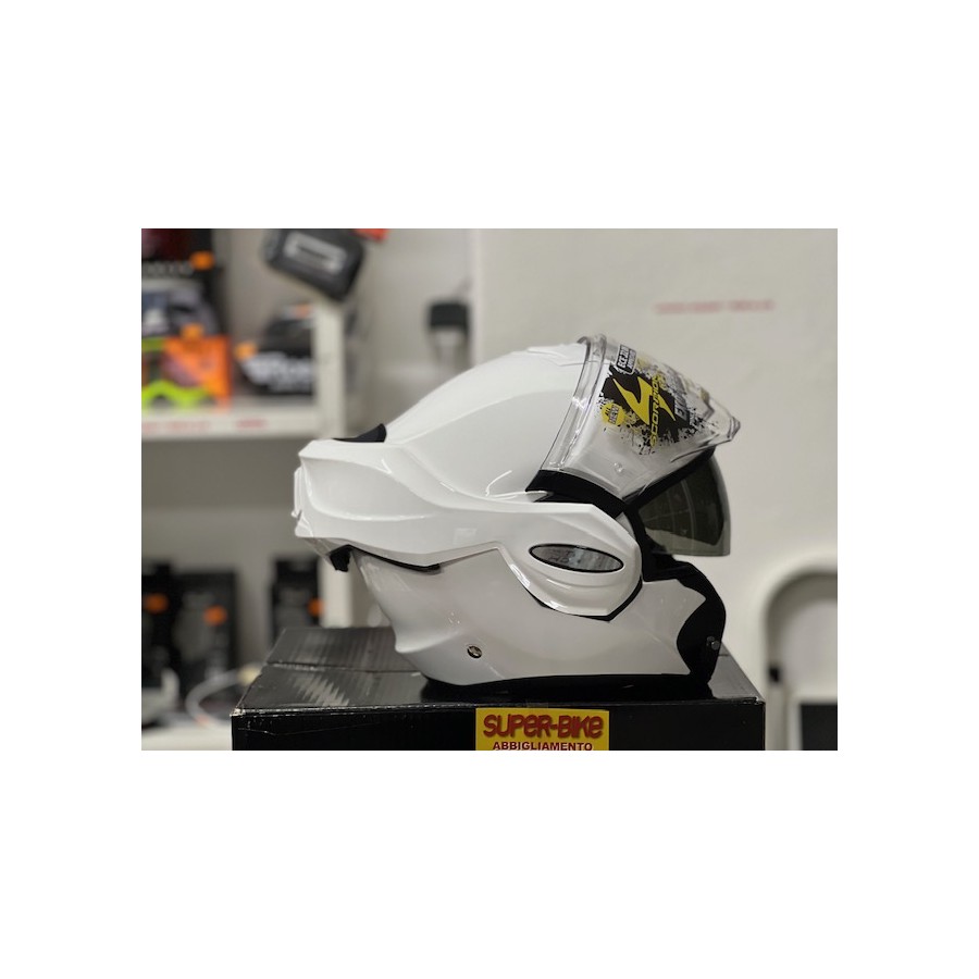 Scorpion EXO-TECH EVO will keine einfache Alternative zu dem sein, was der Markt derzeit im Bereich der Flip-Back-Modulhelme anbietet. Was es einzigartig macht, ist sein einzigartiges Full-Face-Design, die Weitsicht des Antifog ähigen Visiers, die geringe Größe der Schale, die Ergonomie des Kinnschutzmechanismus und der Lufteinlass der Schale, der sich mit einer einfachen Berührung öffnen lässt . Dieser Mehrzweckhelm hat ein Preis-Leistungs-Verhältnis, das in der Lage ist, alle Anforderungen des heutigen Marktes zu erfüllen. EXO-TECH EVO ist ein Helm, der sich auf dem Markt sowohl durch seine ästhetischen Eigenschaften als auch durch die technischen und bequemen Eigenschaften unterscheidet, die Sie während des Gebrauchs schätzen werden.