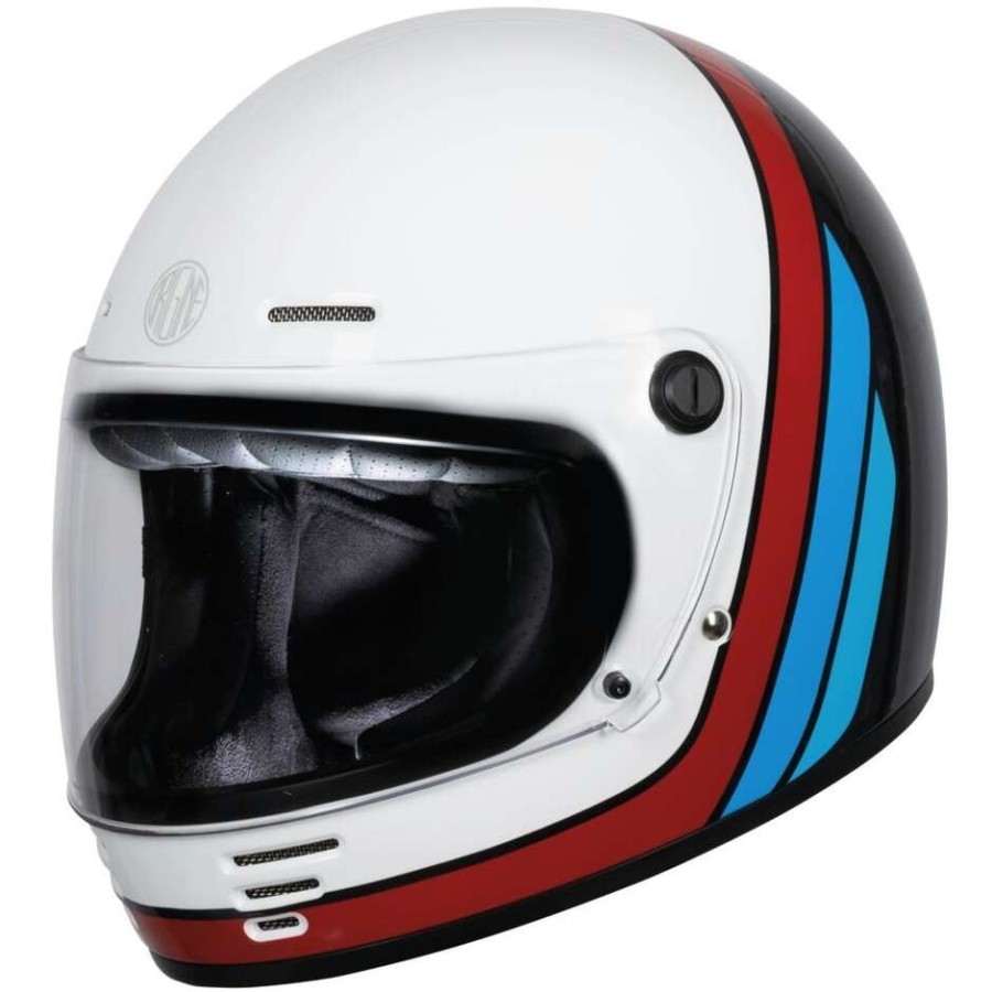 Integralhelm im Vintage-Look aus Fiberglas mit großem, klarem Visier, herausnehmbarem und waschbarem Innenfutter sowie praktischem Doppel-D-Ring-Verschluss.