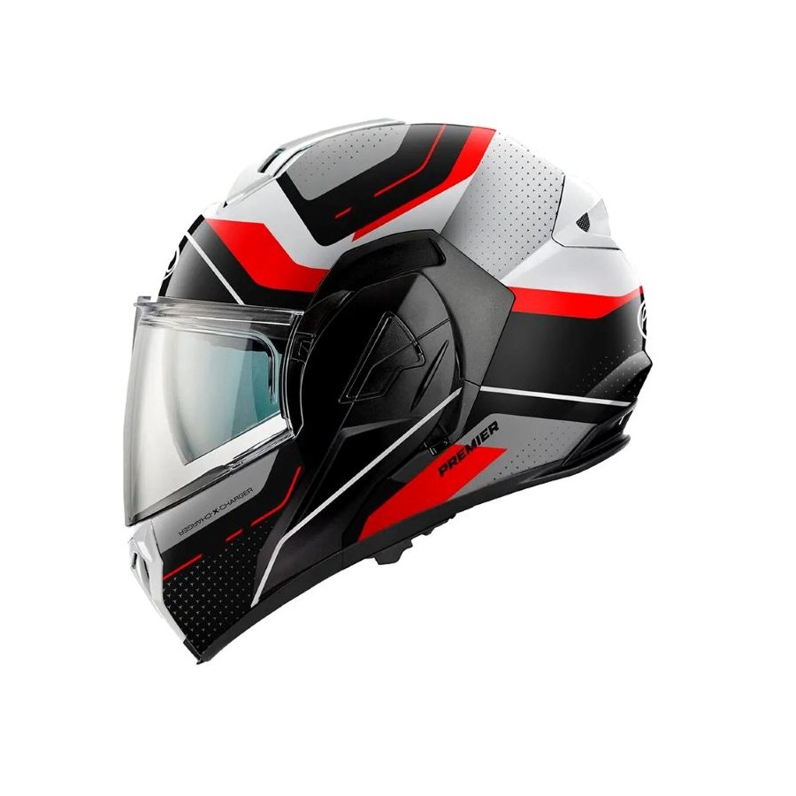 Der Premier X-Charger stellt eine Weiterentwicklung modularer Helme für den Alltagsgebrauch dar. Ausgestattet mit einem voll drehbaren Kinnbügel kann er dank der doppelten P/J-Homologation sowohl als Jethelm als auch als Integralhelm getragen werden. Er verfügt über eine integrierte Sonnenblende (dunkel getönt), die sich bequem über einen seitlichen Hebel an der linken Seite der Helmschale bedienen lässt.