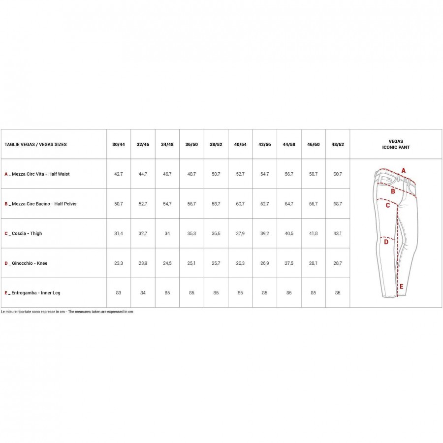 Idas VEGAS-Modell ist intern mit Aramidfasergewebe der neuesten Generation (260gr/qm - 0,8 mm Dicke) verstärkt, das Abrieb standhalten und den Körper und die Haut des Motorradfahrers schützen kann. Die verstärkten Bereiche sind diejenigen, die bei einem Sturz am stärksten betroffen sind: Gesäß, Oberschenkel und Knie.