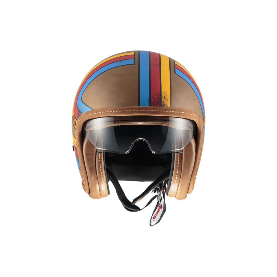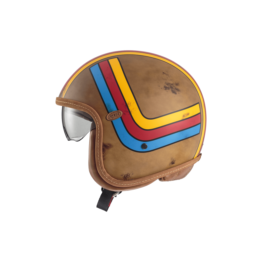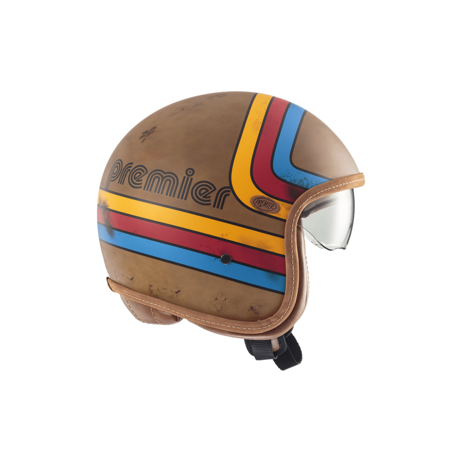 Premier hat stets die Bedürfnisse seiner Kunden im Blick und hat daher das Modell Vintage in seine Kollektion aufgenommen – einen Jethelm mit besonders attraktiver Form, der den neuesten Ansprüchen an Stil und Mode bei Motorradhelmen gerecht wird. Der Vintage ist umschließend, kompakt und mit vielen ansprechenden Grafiken versehen. Er eignet sich ideal für den Stadtverkehr und ist perfekt für alle, die einen schönen und modischen Helm suchen, aber auch für diejenigen, die keine Kompromisse bei der Sicherheit eingehen wollen. Gerade in der Stadt, wo 67 % aller Verkehrsunfälle mit Motorradfahrern passieren, ist dies ein unerlässliches Merkmal. In der Kollektion 2014 präsentiert Premier neue, auffällige Grafiken. Das Modell Vintage ist in zwei Varianten erhältlich: Vintage und Vintage Classic. Die Vintage-Variante umfasst das Carbon-Modell mit einer Außenschale aus vollständig sichtbarer Kohlefaser sowie die Modelle Carbon BM und KEW, deren Schale aus Kohlefaser und Aramidfaser mit Grafiken in mattem, transparentem Lack verziert ist. Bei allen anderen Varianten besteht die Vintage-Schale aus DCA-Trikompositfasern (Dyneema, Kohlefaser und Aramidfasern). Die gleiche Materialzusammensetzung, die Premier für alle seine Fiberglashelme verwendet, basiert auf der langjährigen Erfahrung des italienischen Unternehmens in der Forschung und Anwendung von Verbundfasern. Die Classic-Version verfügt über drei Knöpfe auf der Oberseite der Helmschale, an denen die klassische, klauenförmige Sonnenblende (im Lieferumfang enthalten) oder ein langes Visier (separat erhältlich) befestigt werden kann. Bei allen Modellen besteht die Innenschale aus EPS mit unterschiedlichen Dichten für optimale Aufprallenergieabsorption. Der Vintage-Helm besitzt ein versenkbares, dunkles Visier, das zwischen Innen- und Außenschale untergebracht und leicht zugänglich ist. Das Innenfutter ist aus hypoallergenem, mit Sanitized® behandeltem Stoff gefertigt und komplett herausnehmbar und waschbar. Eine Ausnahme bildet das Classic-Modell, das über ein festes Futter und herausnehmbare Wangenpolster verfügt, deren Kanten mit schwarzem Kunstleder bezogen sind. Der Kinnriemen ist mit einem Doppel-D-Ring-Verschluss ausgestattet. Wie alle Premier-Helme ist auch der Vintage nach der aktuellen ECE 22-06-Norm zertifiziert. Anzahl der Schalen: 1. Material: Dreikomponenten-Verbundfasern und Harz. Gewicht: 990 g ± 50 g. Herausnehmbare Innenausstattung.
