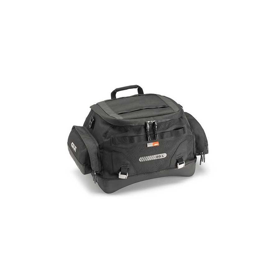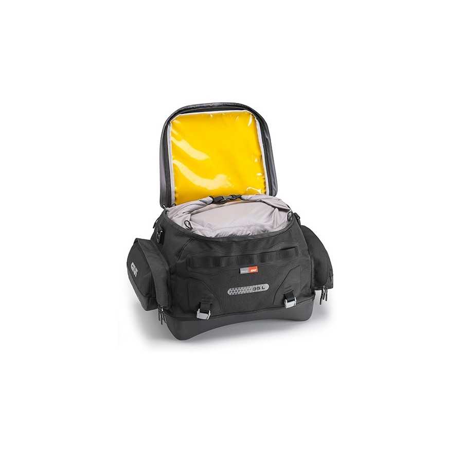 Packtasche für Sattel und Gepäckträger mit wasserdichtem Innensack, 35 Liter. Materialien: Hochfestes Polyester 1200D und Polymerschaumschale. IHypalon Einsätze. Außenmaterial mit hoher UV-Beständigkeit (Ref. ISO 4892 - 2). D Leistung: Wasserdichter Innensack mit IP65-Imprägnierung (resistent gegen starken Regen und extreme Bedingungen). Reflektierende Musteraufdrucke für bessere Sichtbarkeit. 2 Außentaschen