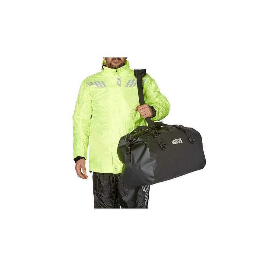 Satteltasche, 60 Liter Materialien: PVC-Plane 500D schwarz hochfrequenzverschweißt; ImDurchlässigkeit IP65: beständig gegen starken Regen und extreme Bedingungen. Dotazioni: Drehverschluss-System zur Gewährleistung der Wasserdichtigkeit; Griff zum Tragen in der Hand; reflektierende Aufdrucke; gepolsterter Schultergurt; 2 elastische Gurte.