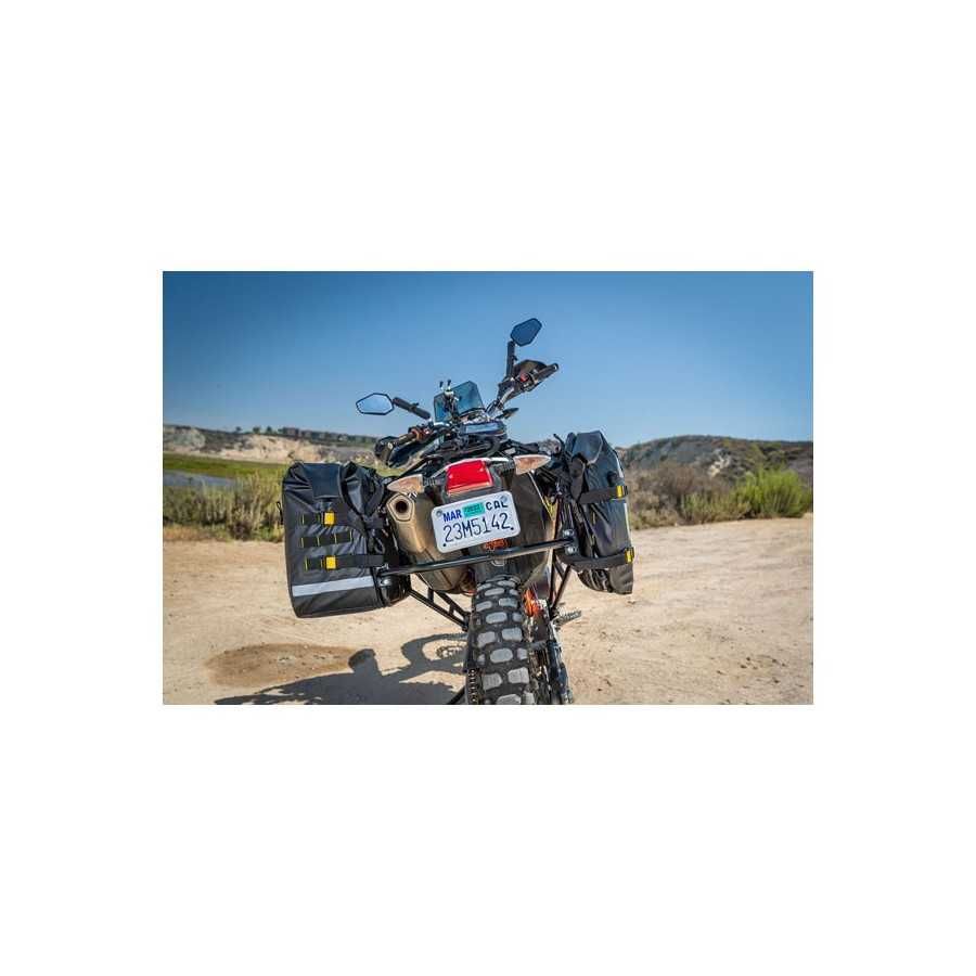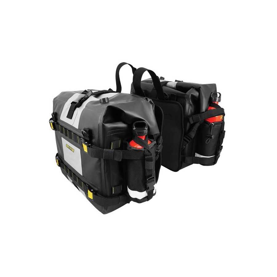 100 % wasserdicht – Alle Nähte sind elektronisch wärmeverschweißt – Hergestellt aus wasserdichter und strapazierfähiger PVC-Plane – Wasserdichter Rollverschluss mit Schnellverschlüssen – UV-beschichtetes Außenmaterial lässt sich leicht reinigen und verhindert Verrutschen oder Markierungen – Sichere Befestigung mit dem patentierten RIGG STRAP®-System – Abnehmbare Versteifung ermöglicht es der Tasche, ihre Form zu behalten, wenn sie leer ist – Seitliche Flaschentasche, die groß genug ist, um 30-Unzen-Flaschen aufzunehmen (Flaschen nicht im Lieferumfang enthalten) – Seitliches MOLLE-Panel, um weiteres optionales Zubehör hinzuzufügen – Jede Seite ist mit Kompressionsriemen für kleinere Lasten zusammenklappbar – Feste interne Rückenplatte hilft Stütztasche - Austauschbares Rückenpolster schützt die Taschen vor Kontakt mit dem Gepäckträger - Metall-D-Ringe können verwendet werden, um die Trockenrollentasche oben zu befestigen - Entlüftungsventil erleichtert die Kompression - Reflektierende Akzente für verbesserte Sichtbarkeit - Enthält 2 leichte Satteltaschen-Innentaschen zum einfachen Verpacken des Inhalts und entfernen - Lässt sich leicht an den meisten Motorrädern mit Gepäckträger montieren - Maße des Hauptfachs: 15" (38 cm) lang x 8" (20,3 cm) breit x 14" (3 5,6 cm hoch - Fasst ca. 28 Liter pro Seite