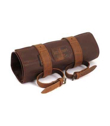 Braun. Hergestellt aus gewachster Baumwolle und Ranger-Lederriemen. Lässt sich aufrollen und bietet vorgenähte Fächer für Werkzeuge und andere Notwendigkeiten. Installiert mit mitgelieferten Lederriemen. Ca. Maße geöffnet: 35 cm x 25 cm.