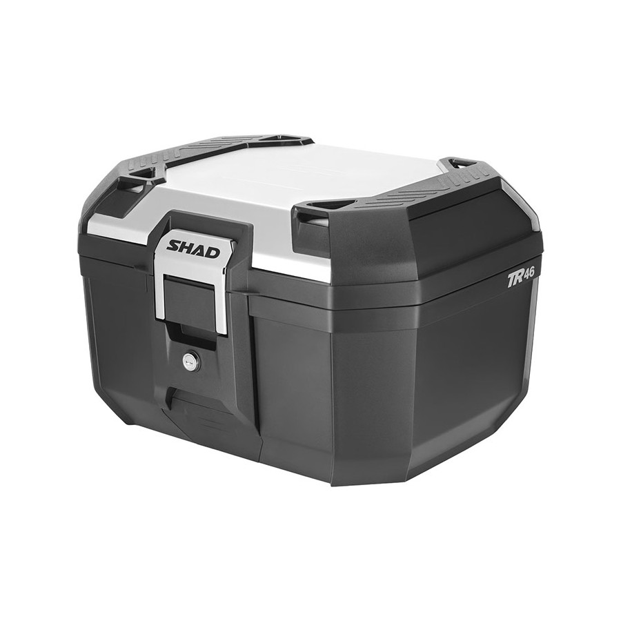 Le TR46 est un top case de la gamme Terra conçu pour l'aventure. Ses matériaux robustes et sa base renforcée, incluant les cadres supérieurs et la structure centrale, en font le top case le plus durable et résistant de sa catégorie. Il est équipé d'une serrure en acier inoxydable avec poignée intégrée et d'un couvercle en aluminium. Il peut accueillir un casque intégral et un casque jet, et supporter une charge maximale de 6 kg. Également disponible sans couvercle en aluminium.