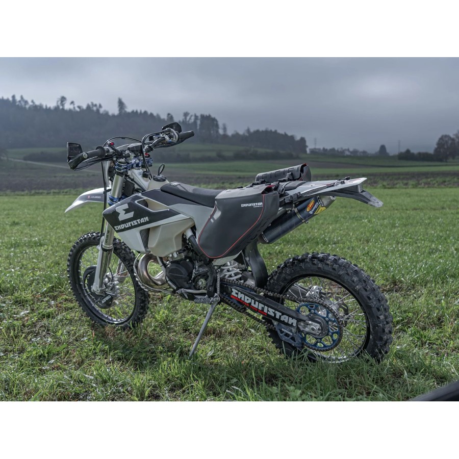 Sieben patentierte Befestigungspunkte – drei an jeder Tasche und einer am Sitz – ermöglichen eine flexible Vergrößerung des Ladevolumens. Die Schnittstelle am Sitz ist so schlank, dass sie die Fahrt nicht beeinträchtigt, selbst auf anspruchsvollen Offroad-Abschnitten. Auch die Mitnahme eines Beifahrers ist möglich, solange keine zusätzlichen Taschen am Sitz montiert sind.