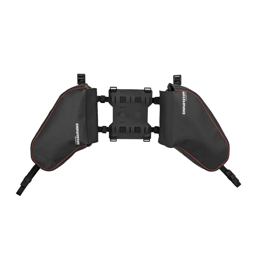 Sieben patentierte Befestigungspunkte – drei an jeder Tasche und einer am Sitz – ermöglichen eine flexible Vergrößerung des Ladevolumens. Die Schnittstelle am Sitz ist so schlank, dass sie die Fahrt nicht beeinträchtigt, selbst auf anspruchsvollen Offroad-Abschnitten. Auch die Mitnahme eines Beifahrers ist möglich, solange keine zusätzlichen Taschen am Sitz montiert sind.