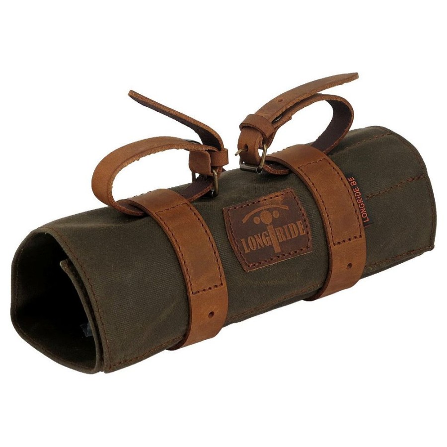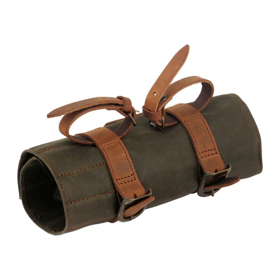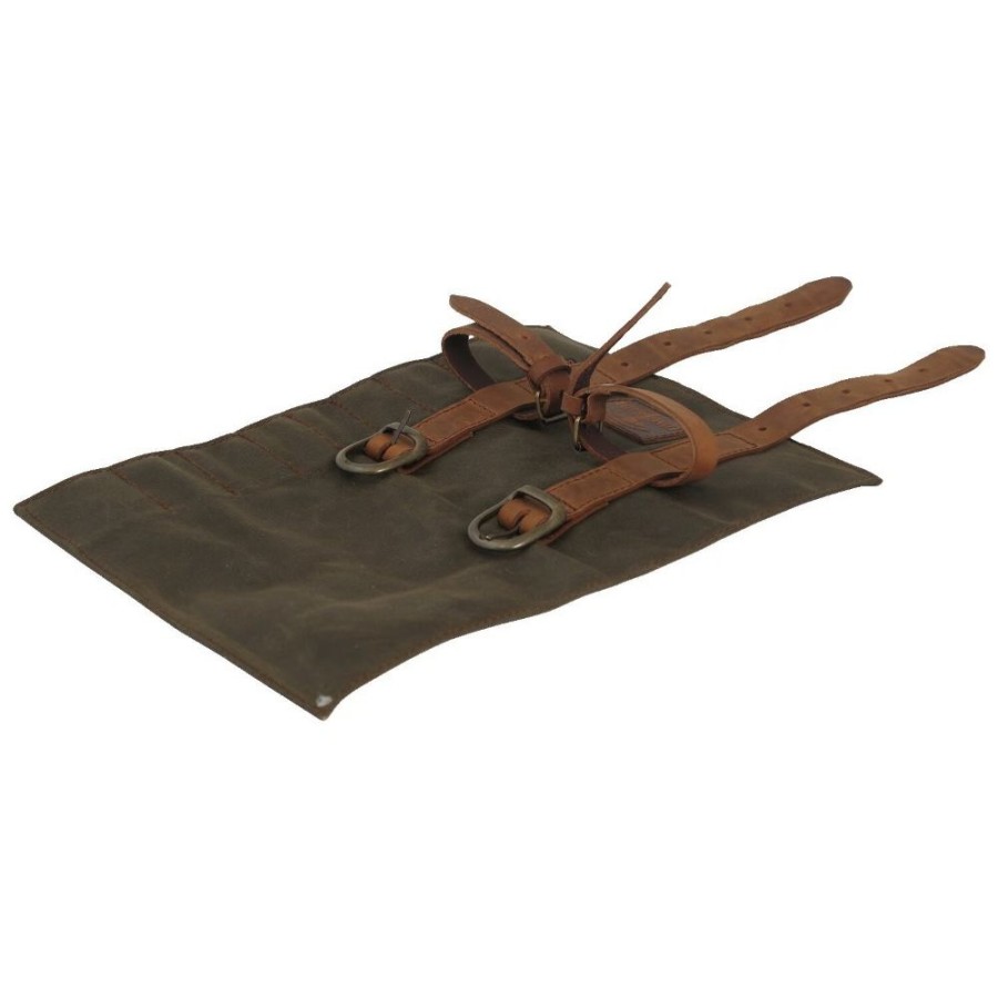 Braun. Hergestellt aus gewachster Baumwolle und Ranger-Lederriemen. Lässt sich aufrollen und bietet vorgenähte Fächer für Werkzeuge und andere Notwendigkeiten. Installiert mit mitgelieferten Lederriemen. Ca. Maße geöffnet: 35 cm x 25 cm.