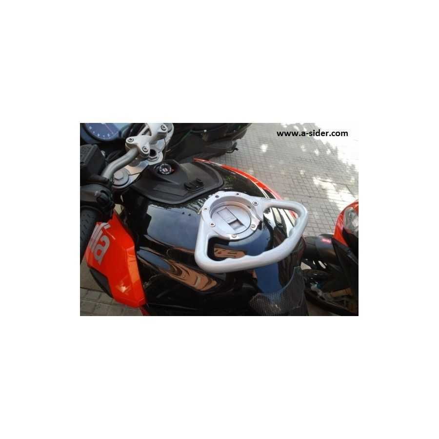 Der A-SIDER wird an dem Tankstutzen verankert. Seine glatte Oberflaeche verhindert moegliche Verletzungen beim Fahrer und Beifahrer. Seine Form erlaubt dem A-SIDER sich in die Linienfuehrung des Motorrades zu integrieren. Seine Funktionalitaet, Robustheit und Design sind die Loesung, die Motorradfahrer lange gesucht haben.