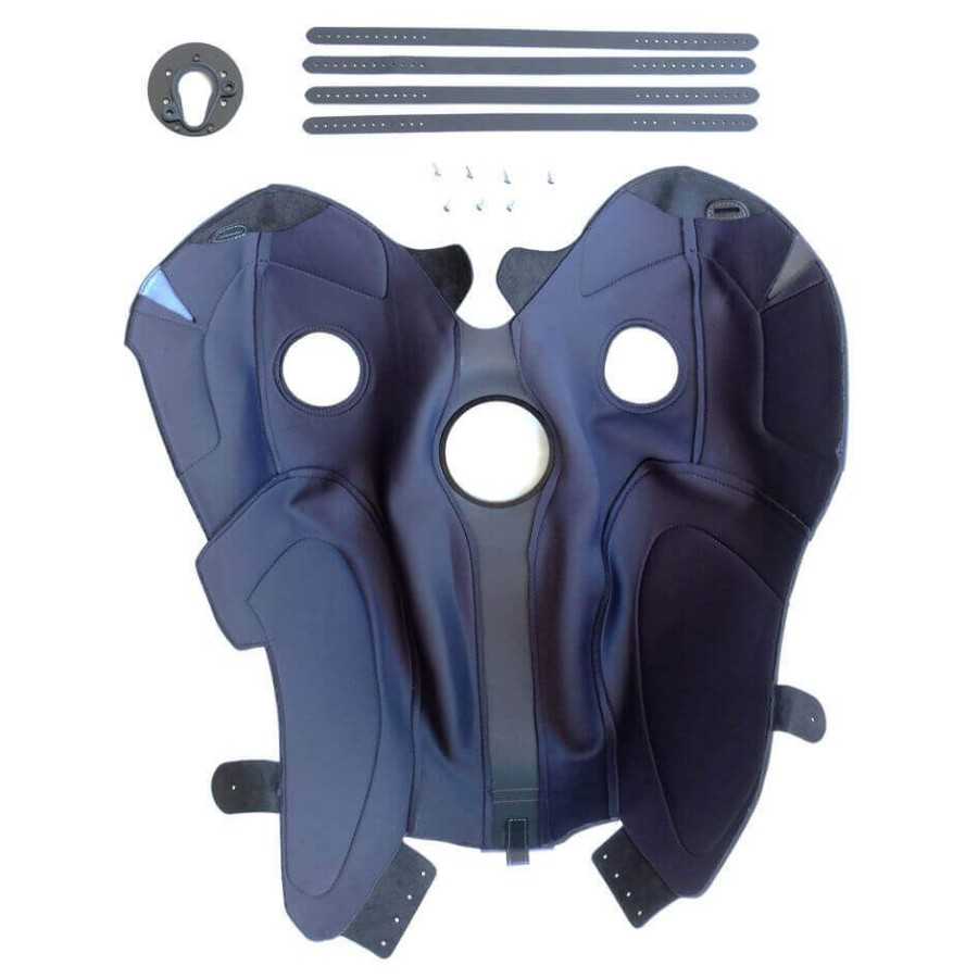 Im Montagesatz ist ein eloxierter Aluminium-Abstandshalter enthalten, der den Tankdeckel anhebt, so dass er nicht nur den Deckel in der richtigen Position fixiert, sondern auch die Befestigung des Gepäckträgers ermöglicht.