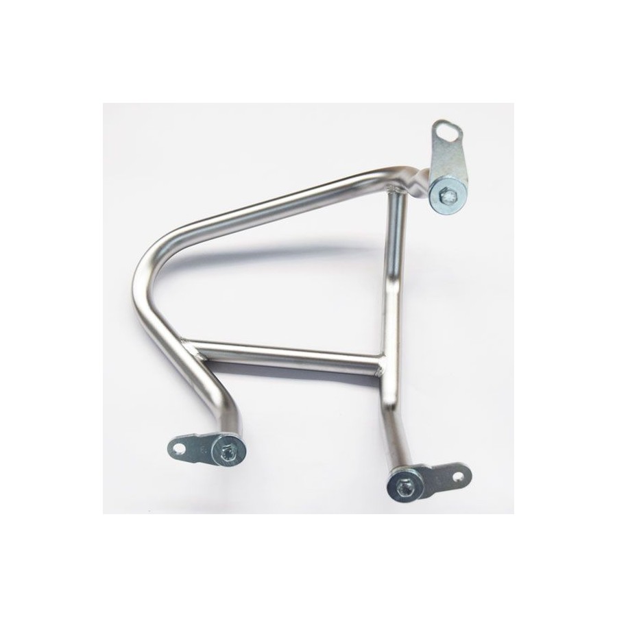 Anders als alle handelsüblichen Motorschutzbügel wird unser Motorschutzbügel nicht direkt an den Befestigungslöchern des Motors, sondern an drei verschraubten Platten befestigt. Diese absorbieren dank eines Schlitzes den Aufprall, ohne ihn direkt auf die originalen Befestigungspunkte des Motorrads zu übertragen.
