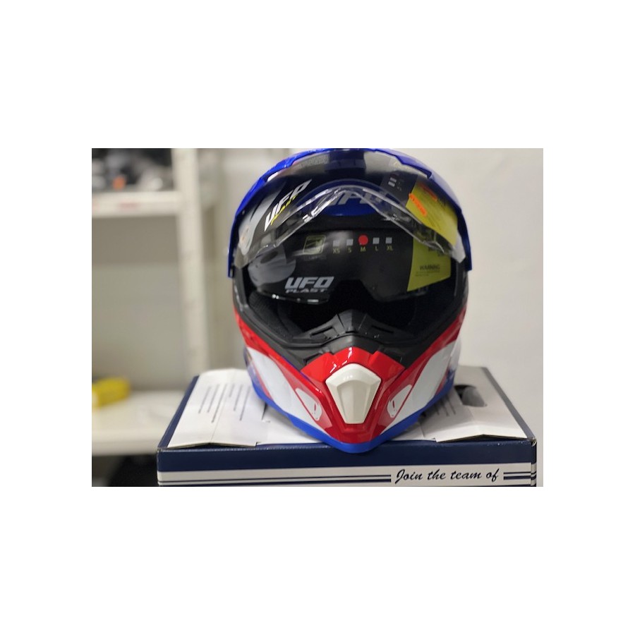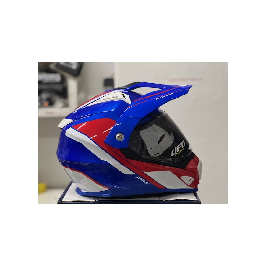 ARIES is the name of the new Ufo Plast enduro helmet with an excellent quality / price ratio, a product designed to move comfortably and safely without sacrificing the style that will appeal especially to the youngest, ideal from grand touring to off-road routes. The high-strength thermoplastic shell, the compact size, the extremely accurate finishes and the design that recalls the cross lines make ARIES an extremely safe and attractive product. The large visor in transparent anti-scratch polycarbonate is removable to allow the use of the helmet with off-road goggles, and combined with the second internal anti-UV smoked visor and the aerodynamic peak of MX derivation (removable for road use) ensure excellent visibility in any condition . The interiors in completely removable and washable hypoallergenic fabrics, together with the efficient ventilation system including large air intake on the chin guard, rear and side air extractors for a high air flow rate guarantee maximum freshness and comfort to the rider. The closure system is micrometric with quick release for maximum ease of use. Micro-adjustable external visor in transparent polycarbonate. Upper air intakes with closing system. Large air intake on the chin guard. Rear air extractors. Removable and washable interior and chin strap. Strap with micrometric adjustment and quick release. Removable clear visor for use with off-road goggles. Removable upper visor for road use. Retractable sun visor with slider. Weight 1560 g (size M). ECE / ONU 2205 certified.