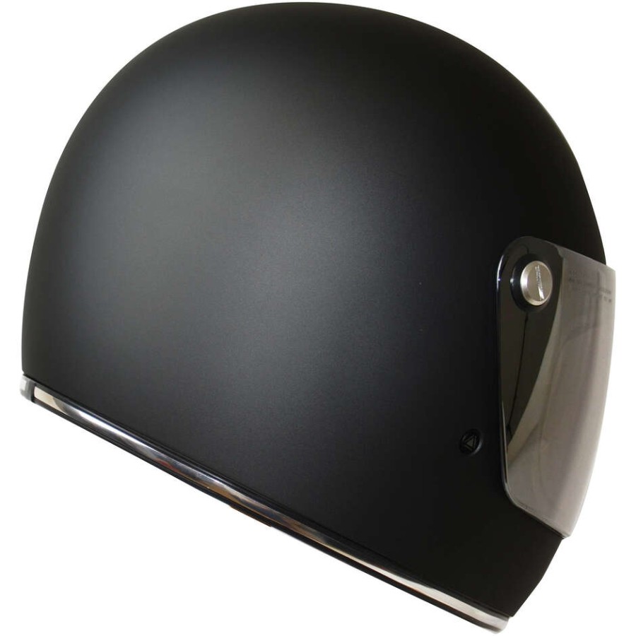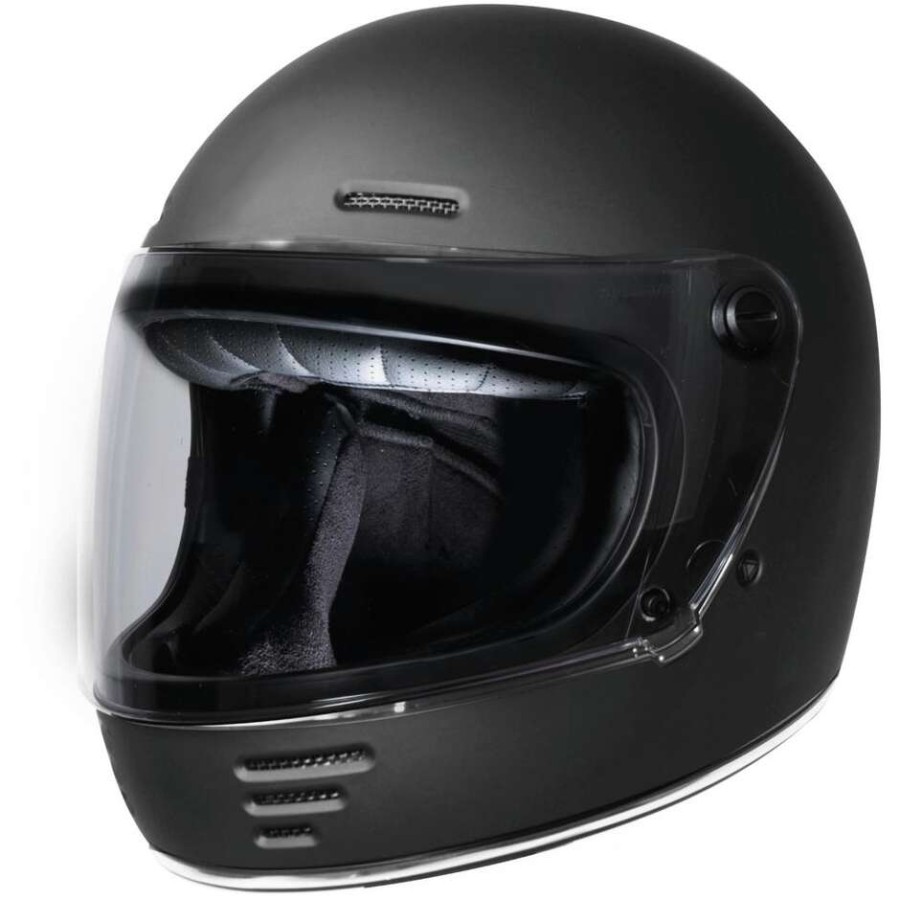 Full-face helmet with a vintage look, made of fiberglass, featuring a large clear visor, removable and washable interior, and a practical double-D closure.