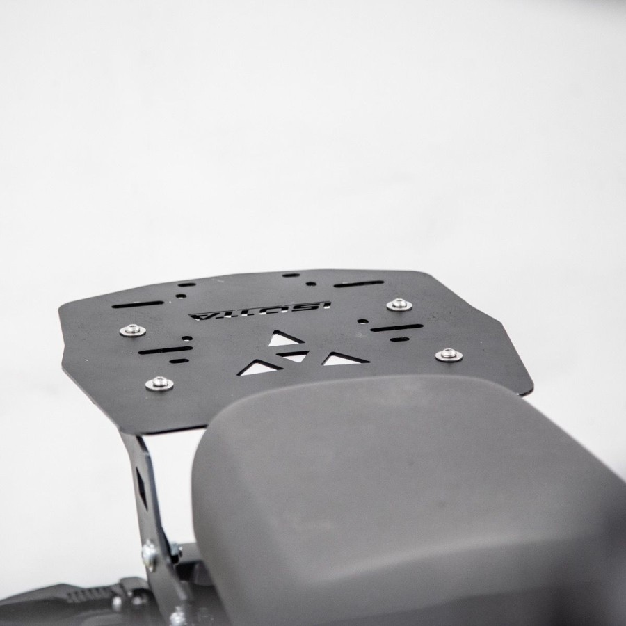 Iron luggage rack with double anti-corrosion treatment. Designed to be used both as a traditional luggage rack for securing a backpack or bag using the dedicated perimeter slots, and to mount a top case using the appropriate plate (items not included). Pre-assembled plastic covers are also included in the strap attachment holes, preventing abrasion to the straps during use.