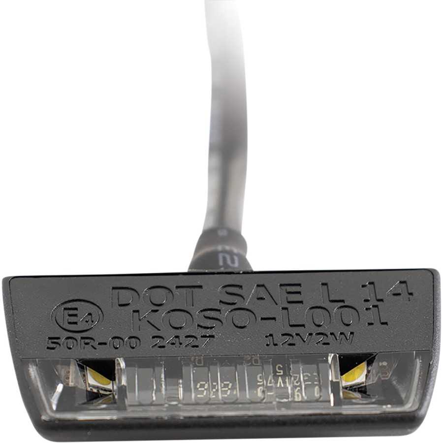 Boîtier noir. Eclairage de plaque d'immatriculation à LED à profil bas homologué E avec LED lumineuses. - Dimensions : 11,3 mm de haut x 26,2 mm de profondeur x 43,7 mm de large. - 2x LED 12V / 2W - 2x boulons de montage 4mm - Distance entre les boulons de montage : 28 mm - incl. matériel, câblage et connecteurs - Longueur de câblage env. 40cm - Homologation E : E4-50R-00 2427