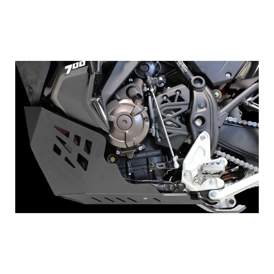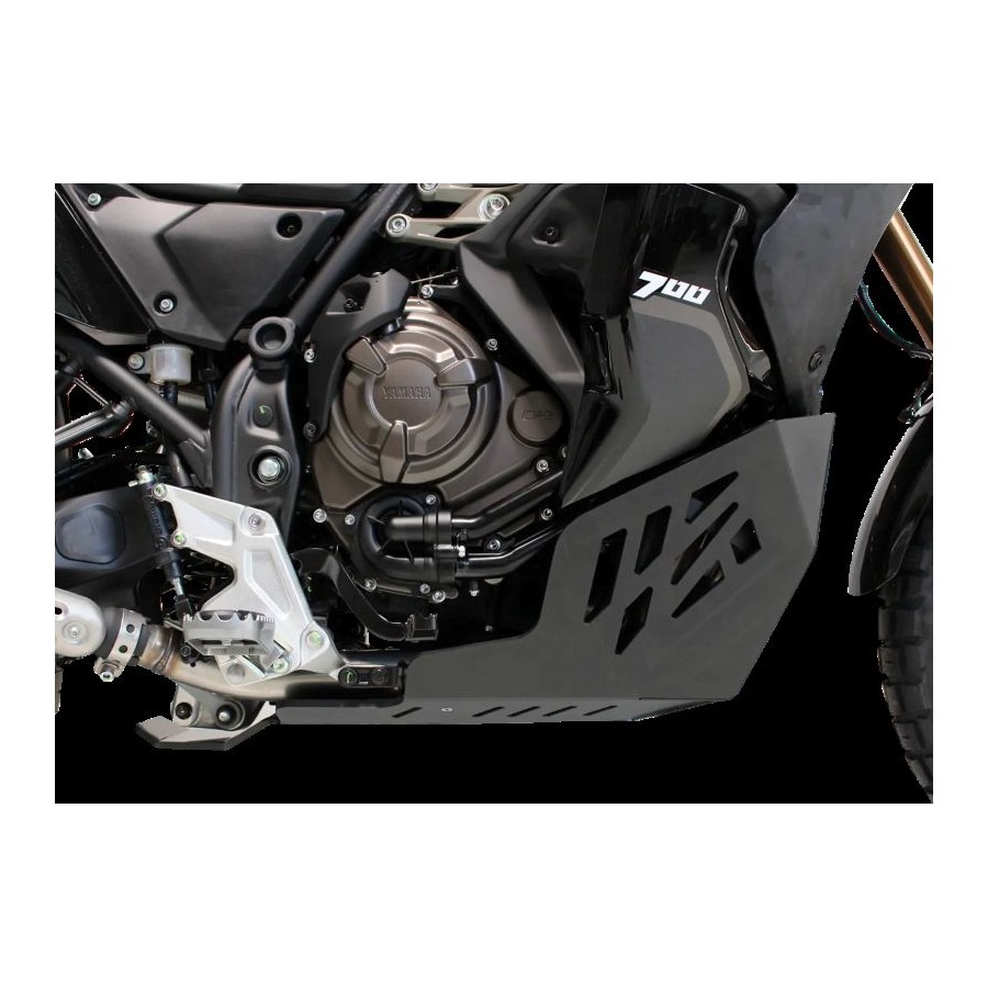 Adventure skid plate Tenere 700 World Raid - Weight : 3.1Kg - This bash plate protects the frame tubes, the linkage, the side stand sensor and the cases by following the bike lines. Its design made from 8mm thick High Density PolyEthylen plastic provides a reinforced protection by being 30 to 40% lighter than its aluminum counterpart. Contrary to aluminum, HDPE reduces the noise of rocks on the plate, does not generate any vibrations and does not undergo deformation. We made it for a pleasant use and an easier maintenance ! This skid plate is not compatible with the after market crash bars (it will require some modifications). The after market centre stands will fit but some cuts at the rear of the skid plate will be necessary. Before ordering, visit the characteristic tab and make sure that your equipment (crash bars and/or centre stand) is compatible with our skid plate. All screws and bolts are included in the package. It fits only Yamaha Tenere 700 World Raid.