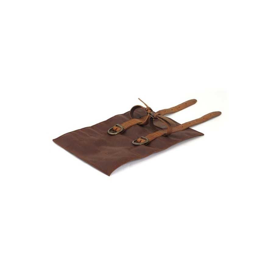 Brown. Made from waxed cotton and ranger leather straps. Rolls open and offers pre-stitched compartments for tools and other necessities. Installs with included leather straps. Approx. dimensions open: 35cm x 25cm.