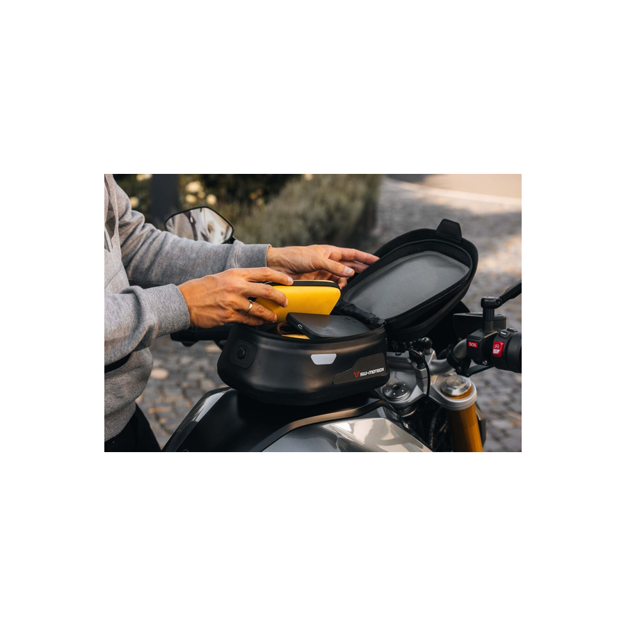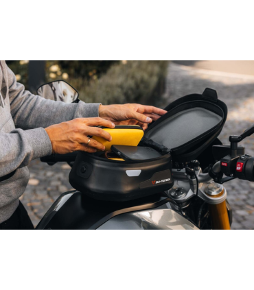 The guide rail of the top ring, which is already attached at the factory, allows easy adjustment of the position of the tank bag on the tank and to the ergonomic needs of the driver. Only the PRO tank bags offer this flexibility. To go with this, SW-MOTECH offers the patented PRO tank rings made of fibreglass reinforced plastic. They are manufactured to match the motorcycle model and attached to the tank filler neck.