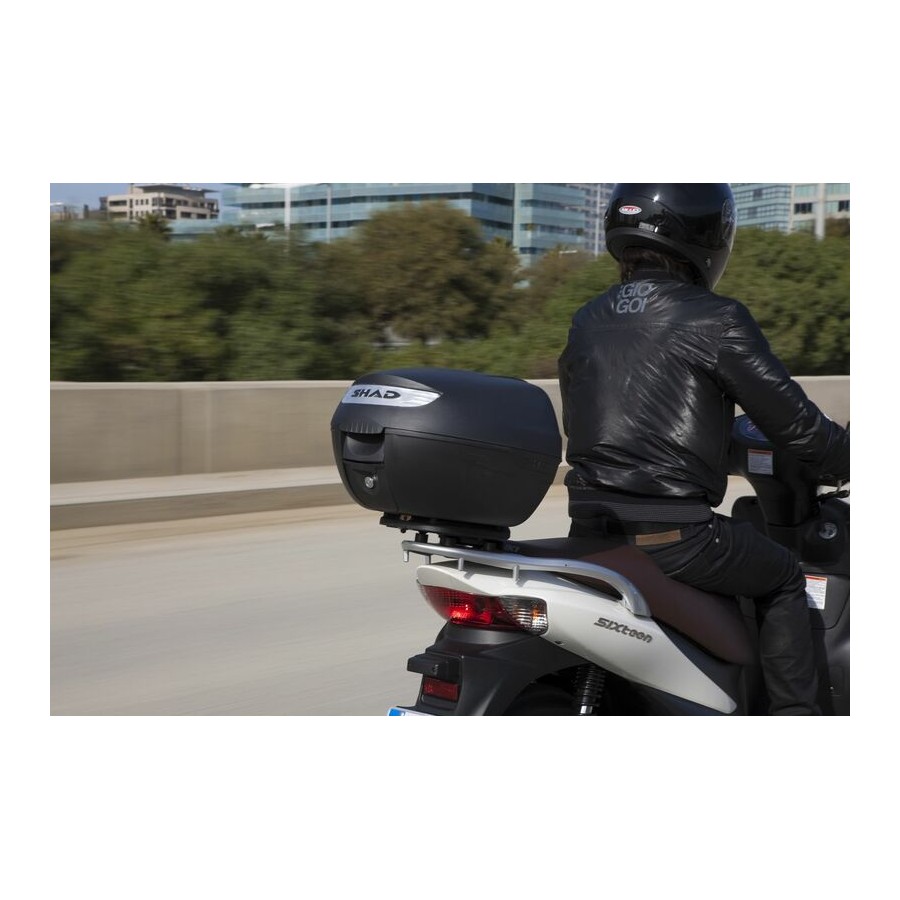 It is the smallest top box in the range (26 litres), with capacity for a helmet, perfect for scooters and mopeds. It is equipped with a pressure lock (Press Lock System) and can be equipped with a cover, available as an optional in different colors." SH26 is the smallest motorcycle case in the SHAD range. Made of high-quality reinforced polypropylene, it is very robust, compact and practical, with capacity for a small modular helmet or a full-face helmet.