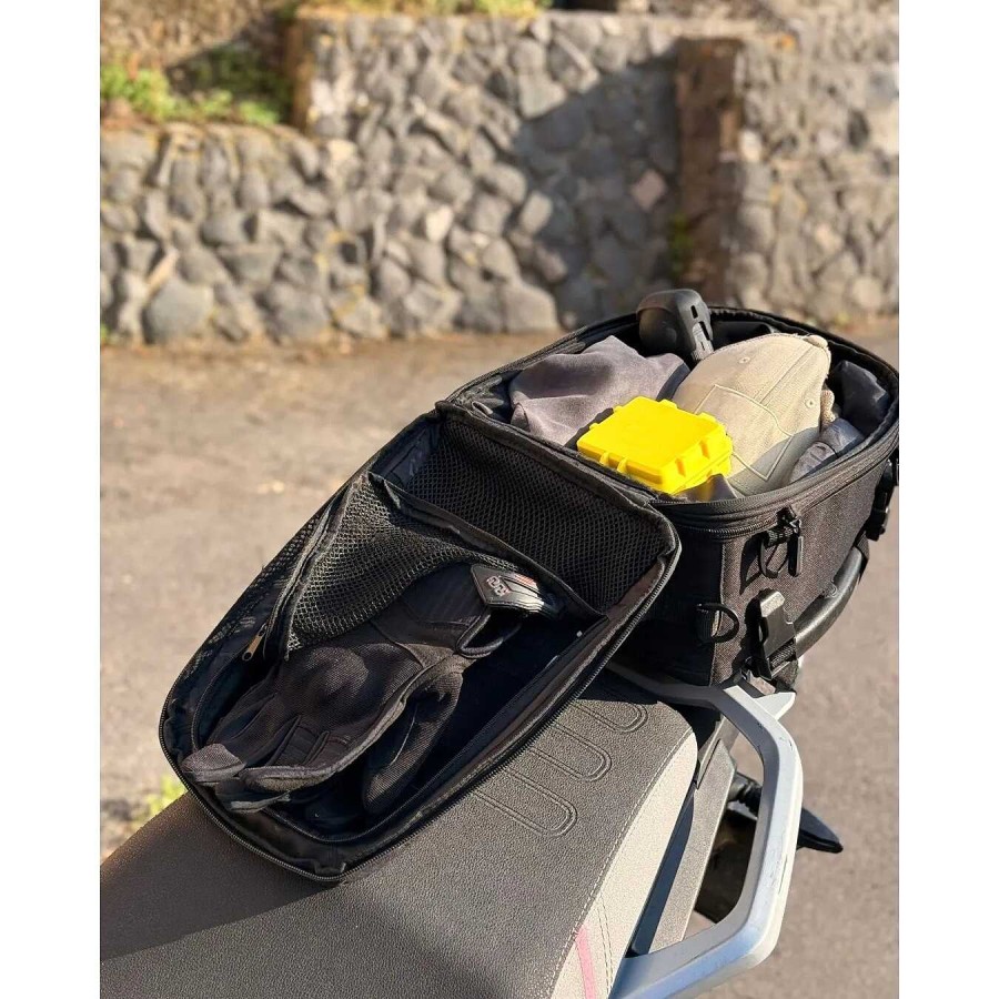 Practical and functional, the REAR PLUS fabric motorcycle saddle bag is the perfect accessory for those seeking a spacious and safe solution for their travels. Thanks to its expandable design, it offers ample carrying capacity that adapts to your needs, without compromising stability while riding. The strap fastening system ensures a secure installation on the motorcycle saddle, while the reflective inserts increase visibility, improving safety in low-light hours. The non-slip base keeps the bag securely in place, preventing unwanted movement, even on the roughest roads. The upper elastic straps can be used as a cargo net, and the internal cover will protect your bag and its contents from sudden rain. Dimensions: 22x35x15/25 cm. Liters: 11 L / 19 L.