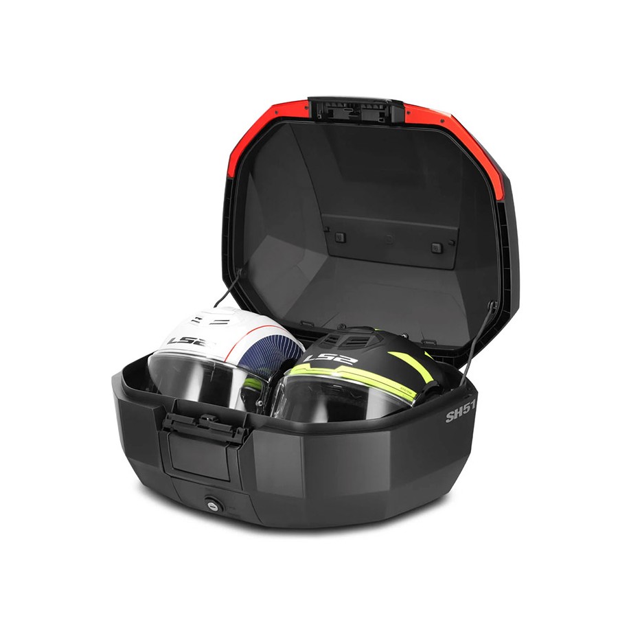 The SH51 offers enough capacity to accommodate two ECE 22.06 modular helmets (one size XL and one size M) and supports a maximum recommended load of 10 kg. The high-quality reinforced polypropylene construction ensures strength and durability, while maintaining a low weight. The aerodynamic design also helps improve the stability of the motorcycle while riding.