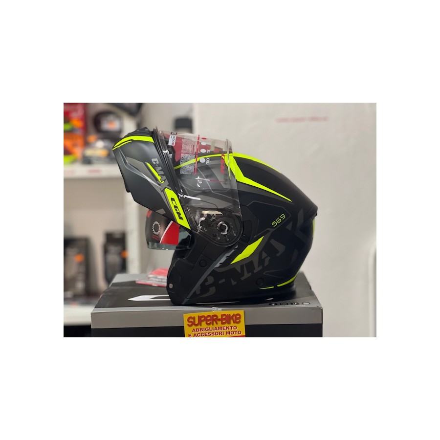C-MAX is the new CGM modular dedicated to those who choose to experience new emotions every day. Style and functionality combine to offer you comfort and cutting-edge performance in all conditions, from the usual urban route to the most adventurous paths, the double P/J approval allows you to travel with the modular helmet in the closed or open configuration. Equipped with visor with anti-scratch treatment, tilting, with lock in closed position and aerodynamic upper profile, Antifog prepared and internal retractable sun visor. With three-zone Air Stream System ventilation and internal channeling. Removable thermoformed hexagonal lining for a better fit comfort, from ExtraCool fabric with reflective bands to increase passive safety and with provision for intercom, the internal padding is made with a special housing for the temples of the glasses. The equipment is completed by a nose deflector, a chin deflector and an elastic strap holder
