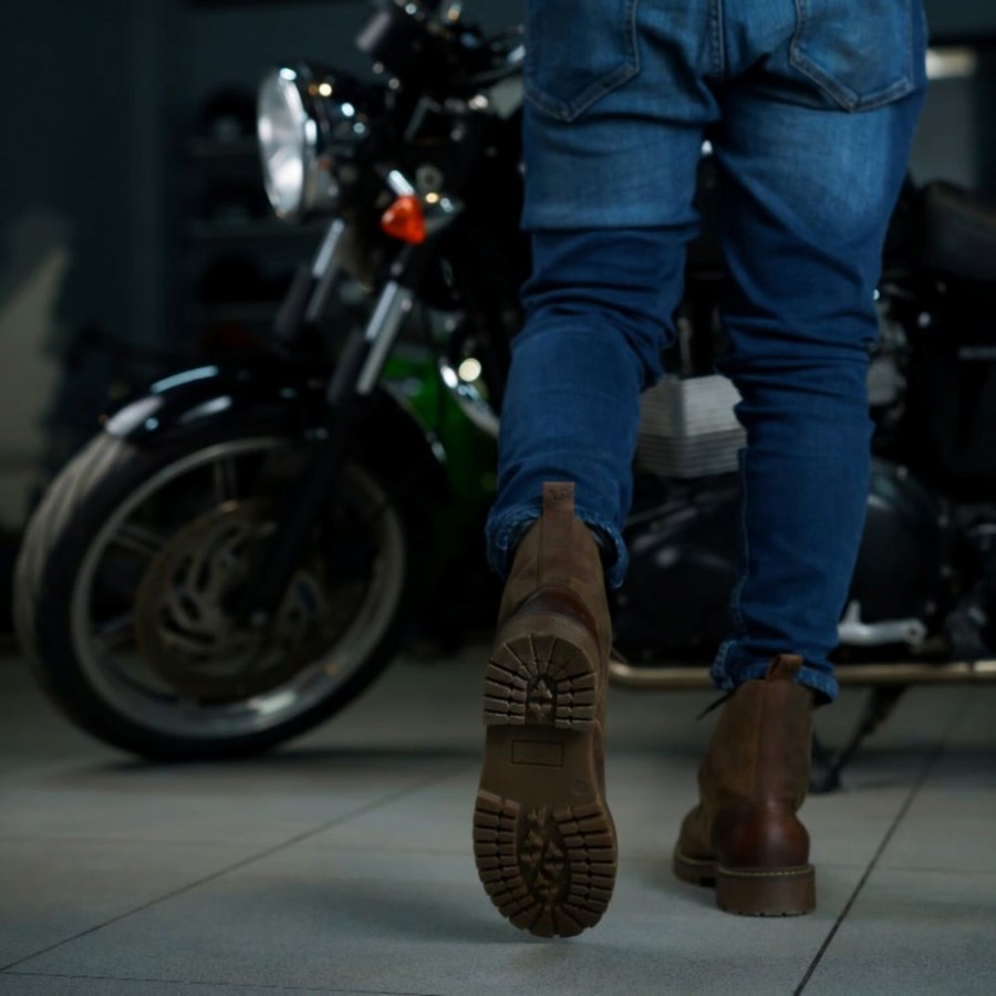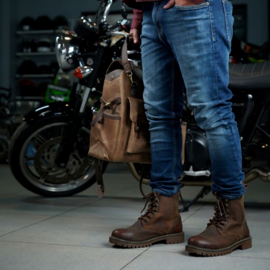 The Trip Machine Derby boots have been the most popular boots. The reinforcements in the toe, heel and ankle are robust and we have increased the gauge of the leather by 2 mm to improve abrasion resistance. The footbed is constructed from a memory foam to provide better comfort. The boots are still constructed from waxed leather with a metallic shank, and a texon insole, to give you the confidence to go anywhere. These boots are lined with lycra and leather to give the best comfort for long time wear with metal hardware finished in antique gold, the boots provide a blend of durability, luxury and style. The sole is an extremely light weight which makes these one of the lightest motorcycles boots out there.