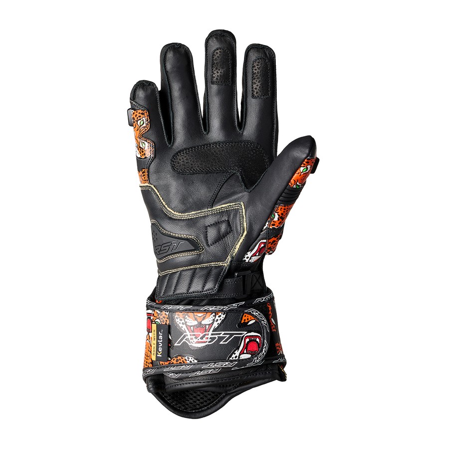 Made with both full-grain cowhide and kangaroo leather, the glove features a CE Level 1 Carbon Knuckle Protector for impact protection. DuPont™ Kevlar® Fibre on the palm stitching and underlay, along with double layer kangaroo leather and an RST palm slider protect the palm in the event of a high speed slide, while the double wrist and cuff closure offer a secure fit. DuPont™ Kevlar® lining throughout the rest of the glove prevents tearing, and elasticated conjoined fingers to prevent “finger roll” without affecting reach or flexibility when changing gear.