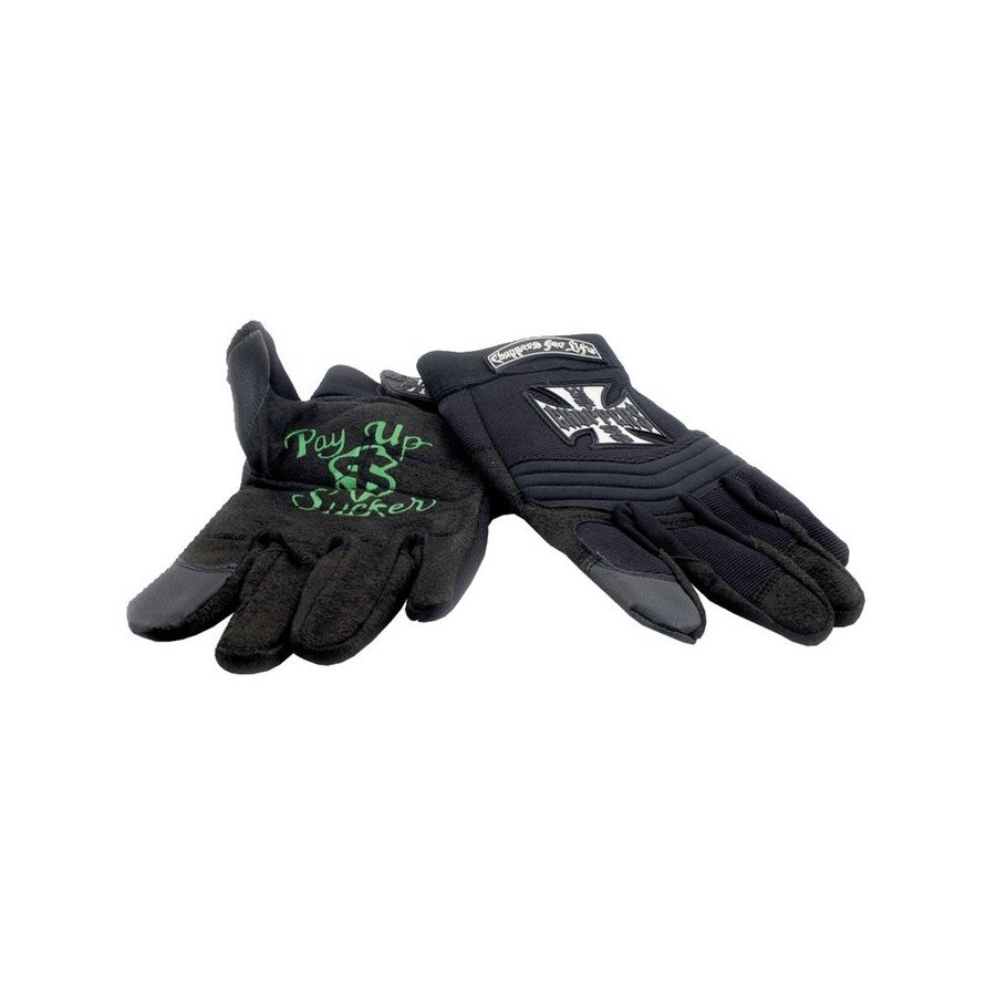 The WCC classic sturdy Riding gloves. The upper features the iconic WCC choppers logo and the inner palm has the “pay up socker” logo printed.