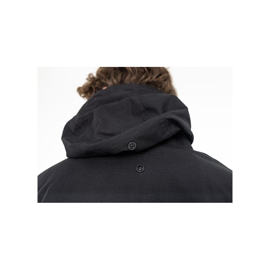Button fastening at the top of the hood to prevent flapping in the wind