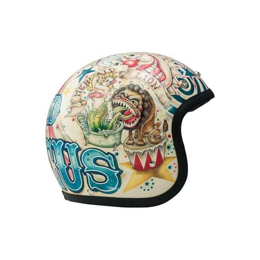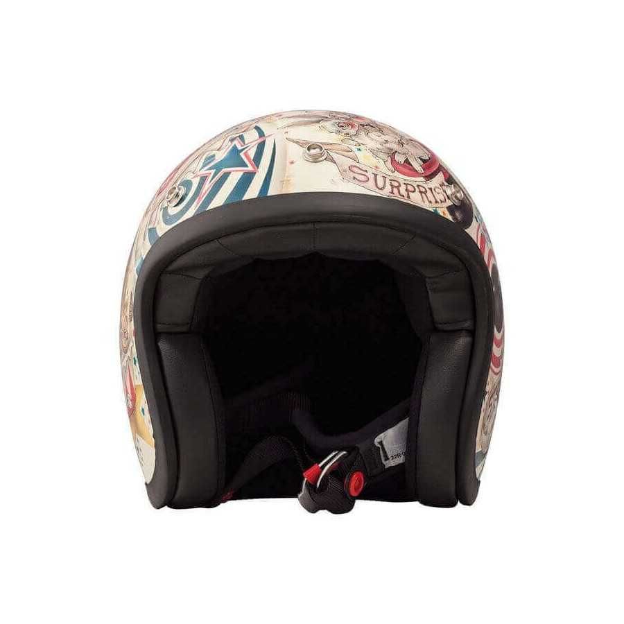 The Retro helmet is a remake of the famous and iconic helmet from the 70s. It is the smallest approved helmet in its category. The shell is made of fiberglass and has a high level of comfort thanks to its fabulous interior lining. The main interest of the company was to change the traditional helmet with a retro version in order to make it a fashion accessory with an original design. The collection is available with more than 30 graphics; each model has its own personality and all of them have fantastic designs. TECHNICAL DETAILS: - Fiberglass shell - Removable and washable interior - Two different shells for maximum comfort and compactness - Integrated buttons on the shell for visors - Double D-ring closure strap - ECE 22.06 approval - DOT SIZES: - XS - 54 cm - S - 55 cm - M - 56/57 cm - L - 58 cm - XL - 59/60 cm