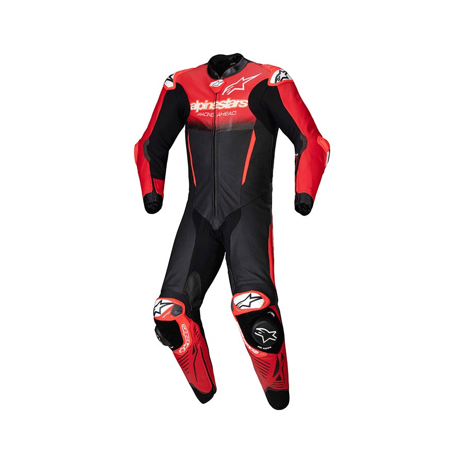 Pre-curved arms, legs and body, with extended multi-directional leather accordions at the shoulder blades, lower back, and knees for an enhanced ‘Race Fit’