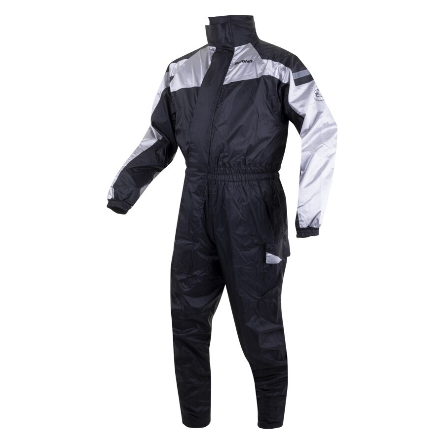 Waterproof rainsuit, made from nylon, with leg bottom fastening, wallet pocket and reflective panel for visibility.