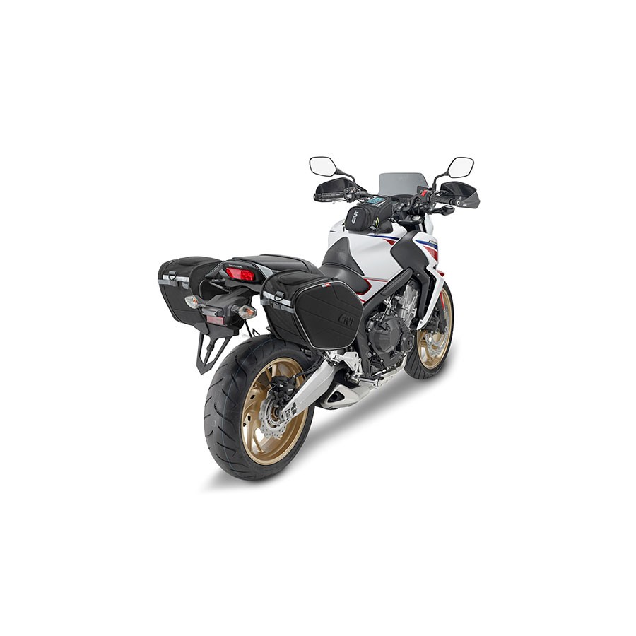 Pair of small expandable saddle bags 30 ltrs System of rapid lock with belts, with hook and loop fastener and central safety belt. Materials: made with polyester 600D PU, the thermoformed frontal in EVA, coated in Lycra, increases rigidity and stability. All materials are developed in accordance with Reach regulations. ((CE) n. 1907/2006). Equipment: Rain cover. Shoulder belt. 2 elastic bungees with hooks. Reinforcements in rigid plastic.