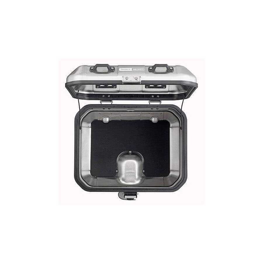 Trekker Dolomiti MONOKEY® case in a natural aluminium finish, 46 ltrs. Deep-drawn base and lid, stainless steel rivets. Security Lock with standard dust-cover screw-top. Hooks to attach an elasticated cargo net on the underside of the lid. Four nylon belt-strap loops on the lid, which enable the mounting of additional bags using Trekker Straps. Capacity to store one full-face or one modular helmet, or two jet helmets.