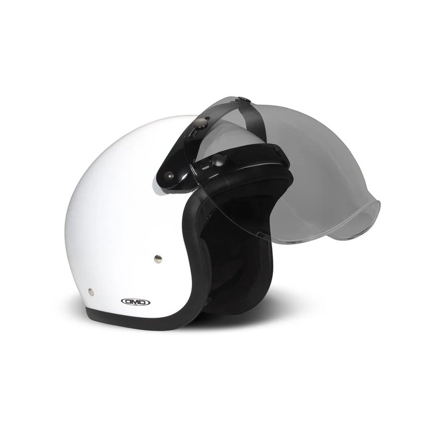 The Flip-Up bubble visor is designed for DMD Jet motorcycle helmets, applicable through the presence of buttons on the helmet shell itself. It also can fit on other brand helmets with a three button point. This visor can be raised and lowered at any time. The Flip-Up visor for open face helmets is available in several colors.