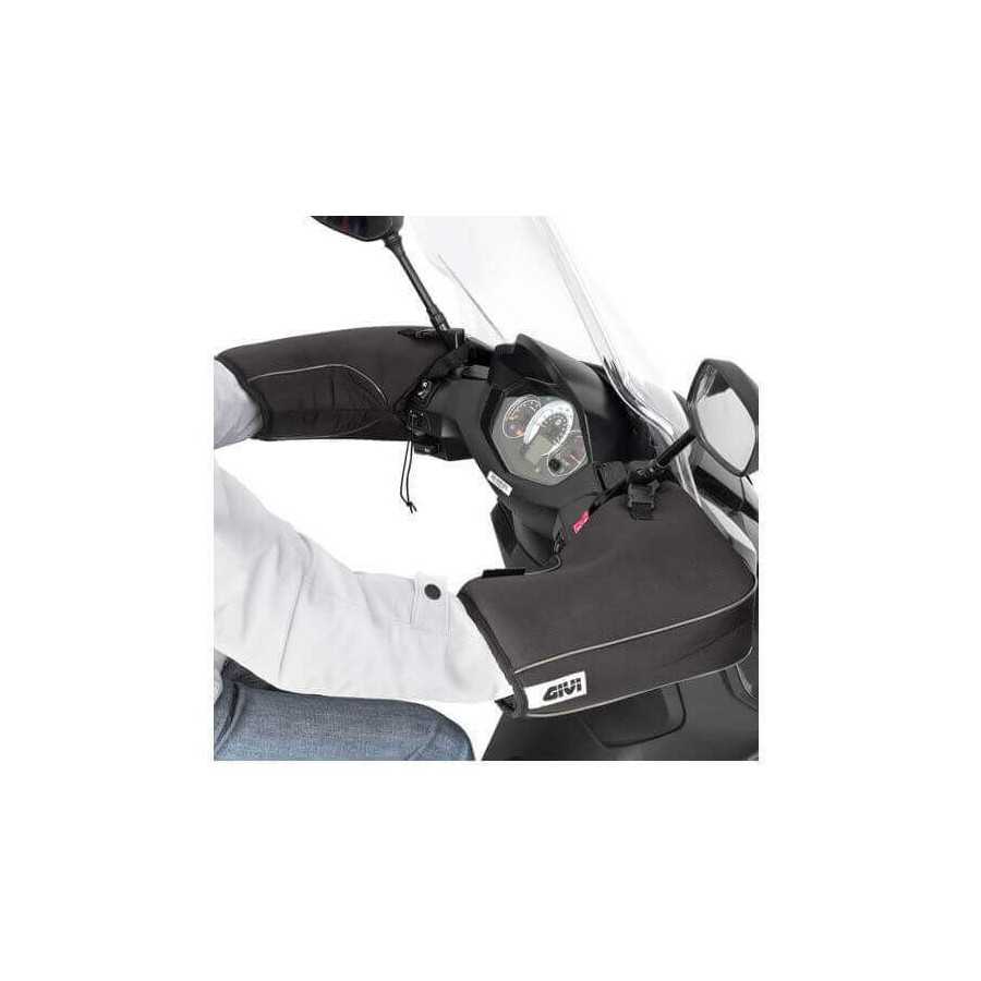 Pair of protective handle-bar gloves for motorcycles and scooters adjustable for use with fixed mirror. Yet another URBAN model, this time to mount on your vehicle. It is a previously unseen version of hand protectors: Givi has made them in rain resistant polyester with an internal lining that keeps the fingers warm in all conditions. The use is universal as the TM418 pair adapts to every type of handle-bar and rear-view mirror. The structure is rather rigid for easier and quicker accessibility of the hands.