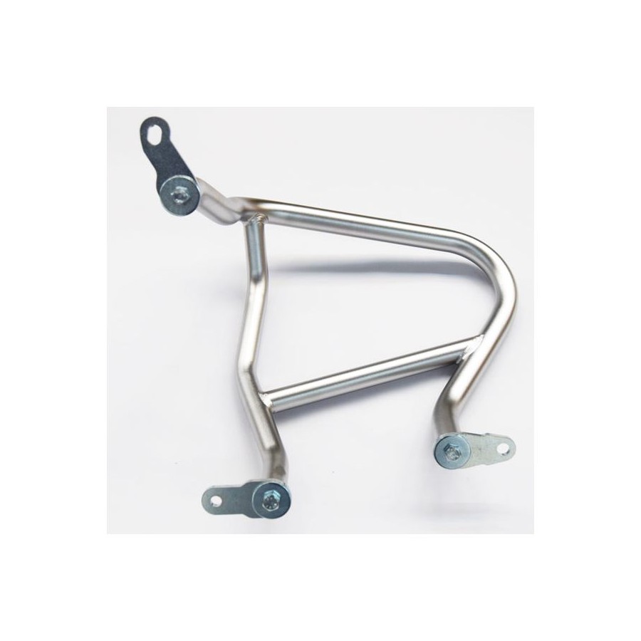 Contrairement aux protections moteur disponibles sur le marché, la nôtre n'est pas fixée directement aux points de fixation du moteur, mais à trois plaques vissées qui, grâce à une fente, absorbent l'impact sans le transmettre directement aux points de fixation d'origine de la moto.