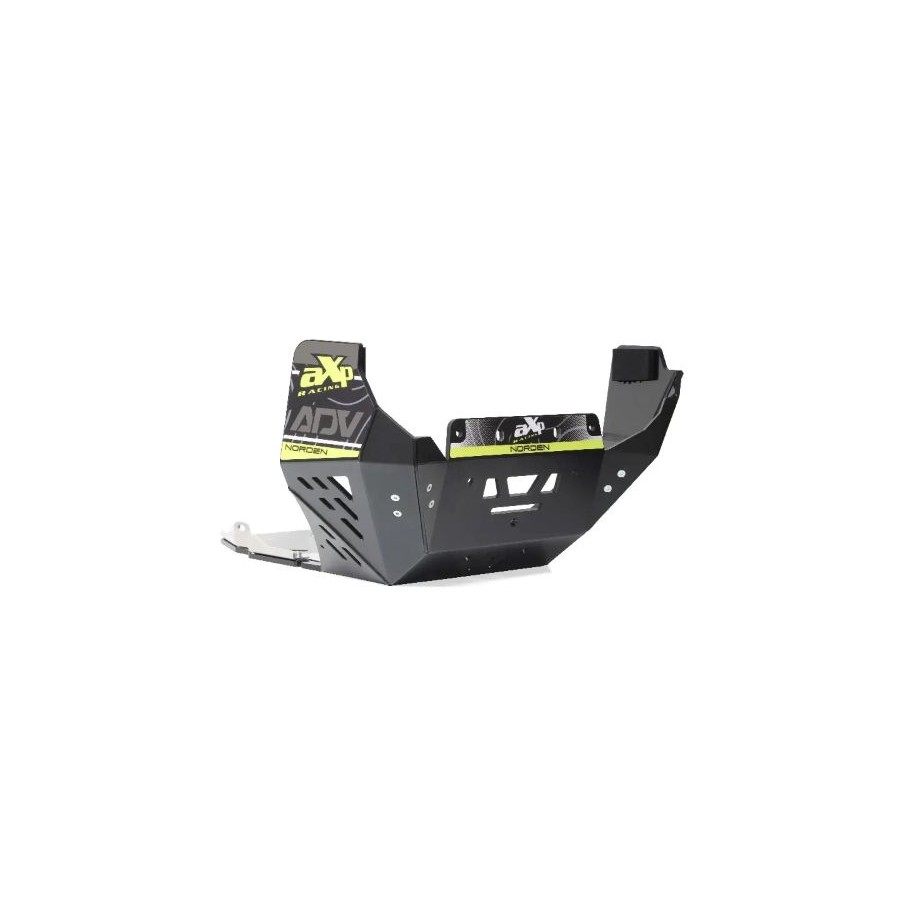 Sabot moteur Husqvarna Norden 901 - Version renforcée - Poids : 3,8 kg - Le sabot moteur AXP pour Husqvarna Norden 901 a été conçu pour protéger le bloc moteur et le réservoir des chocs violents. Fabriqué en polyéthylène haute densité (PEHD) de 8 mm d'épaisseur, cette version renforcée utilise un système de fixation spécifique à l'arrière pour une résistance maximale et n'est absolument pas en contact direct avec le moteur afin d'éviter tout dommage. Il est conçu pour une utilisation tout-terrain intensive, notamment pour le franchissement de troncs ou de rochers. Une mousse de 8 mm d'épaisseur est fournie pour être placée entre le sabot et le réservoir et ainsi réduire les frottements. L'autocollant est fourni mais non collé sur le sabot. Un garde-boue est inclus et permet d'évacuer un maximum de débris du sabot sans affecter le refroidissement. Avantages par rapport à l'aluminium ? Plus léger, plus silencieux, le plastique ne génère pas de vibrations et ne se déforme pas après un impact ; un atout précieux lors de l'entretien. REMARQUE : Ce modèle n’est PAS COMPATIBLE avec une béquille centrale. Si votre moto est équipée d’une béquille centrale, veuillez consulter notre deuxième option, la version TOURING, conçue pour une utilisation sur route et hors route légère, disponible sur la page AVENTURE. Avant de commander, consultez l’onglet Caractéristiques et assurez-vous que votre équipement (barres de protection et/ou béquille centrale) est compatible avec notre sabot moteur. Toute la visserie est fournie.