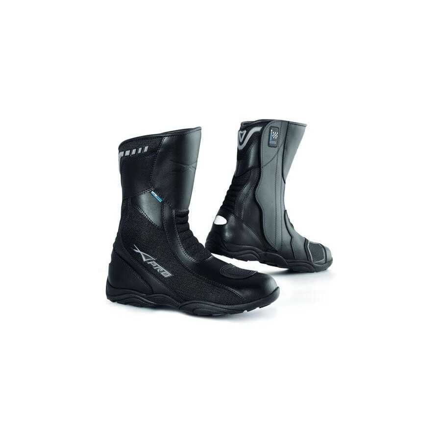 MATÉRIAUX: cuir. PROTECTIONS: tibia, talon et cheville. À L'INTÉRIEUR: polyester. TAILLES: du 40 au 46. La couleur noire . Chaussure Étanche dans un matériau hautement technique et conçue pour un confort de conduite. Renfort à l'orteil. Semelle à semelle crantée différemment pour augmenter l’effet de glissement sur les plateformes. Insert thermoformé pour protéger la cheville, le talon et le tibia. Rembourrage doux.