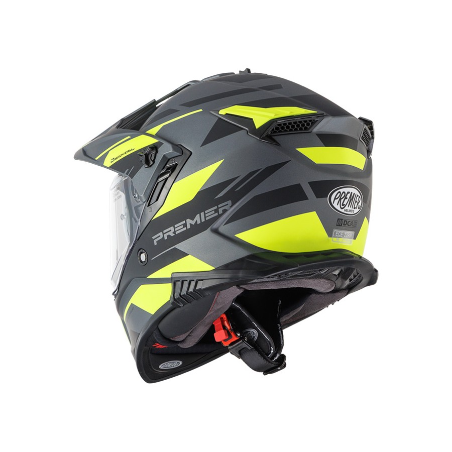 La visière en polycarbonate résistant aux rayures est également équipée d'une visière intérieure sombre pour une conduite optimale dans toutes les conditions météorologiques et de luminosité, cette visière est actionnée par un levier sur le côté gauche du casque.