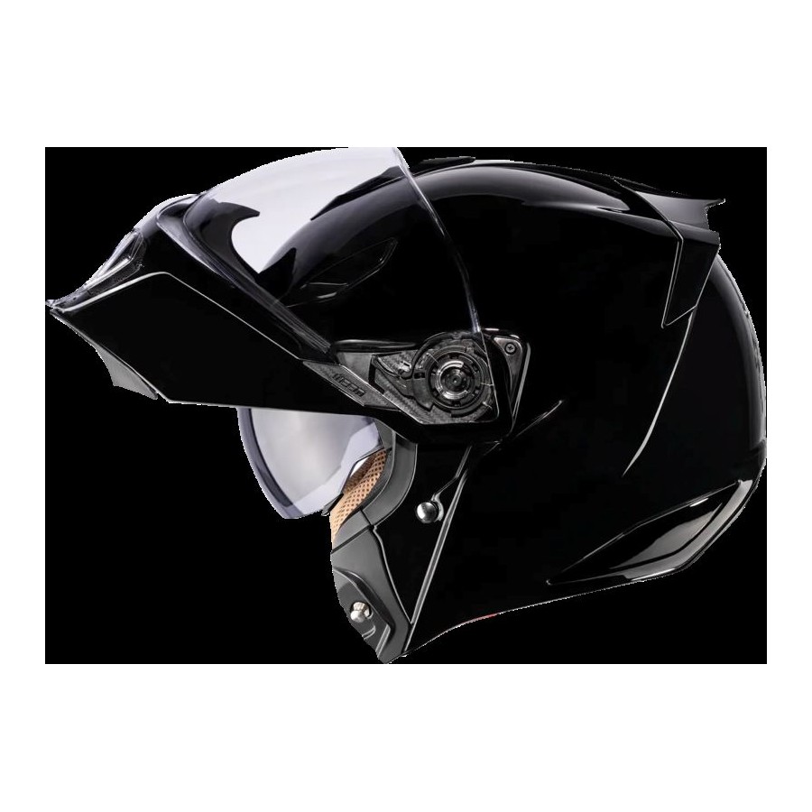 La mentonnière relevable modulable, dotée d'un bouton d'ouverture facile, allie praticité et sécurité sans compromettre la structure ni la confiance du pilote.