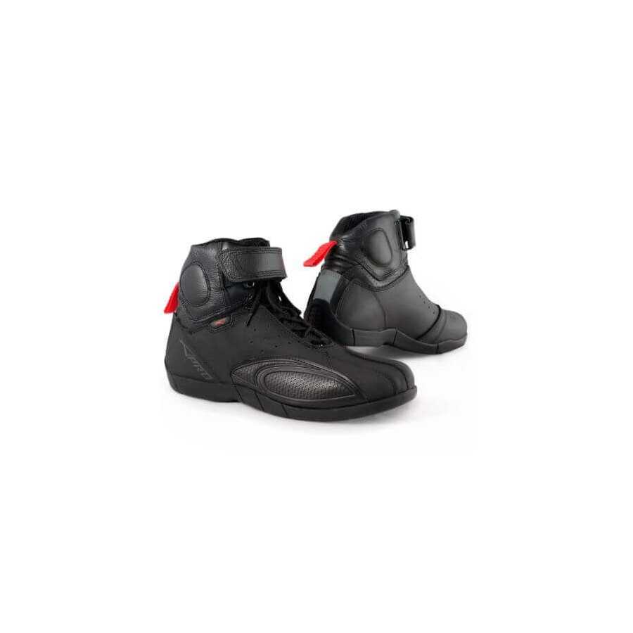Shoes Sport / Touring / Scooter / Enduro / Custom . • MATERIALS: leather . • PROTECTIONS: shin, heel and ankle . • INSIDE: polyester . • SIZES: from 37 to 46 . • COLOR: black . • Sports Shoes and technical material designed for greater driving comfort . • Multi rubber compound sole to improve grip on the footrest . • Reinforced round toe .. • Reinforced shin shield anatomic mould with soft inside cushioning . • Moulded padding for malleolus protection .