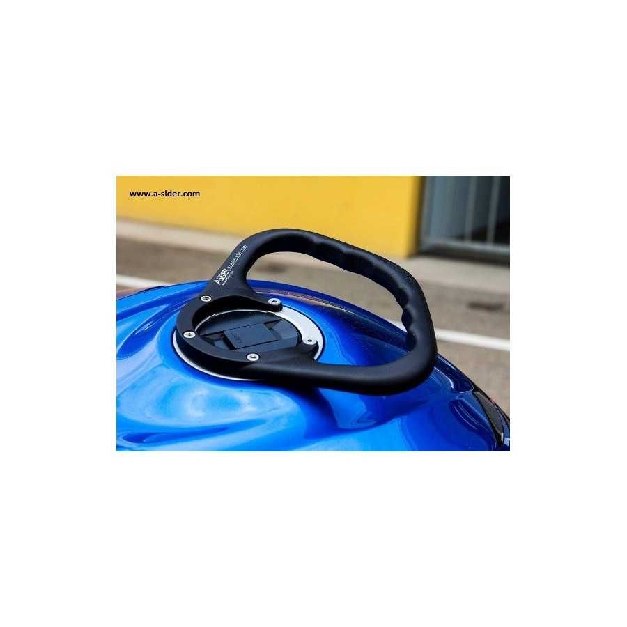 Le produit A-SIDER offre au passager d’une moto sportive un point d’ancrage garant de sécurité et de confort grâce à sa fixation sur le bouchon du réservoir d’essence, l’endroit où le passager pose le plus souvant ses mains.