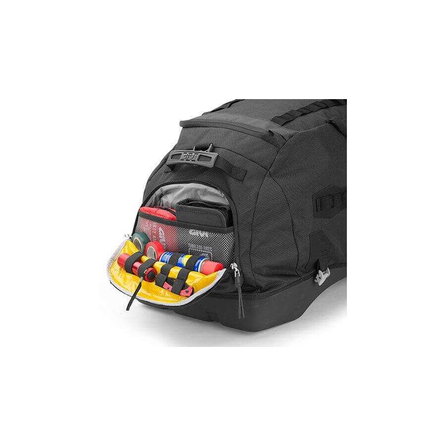 Top bag, 65 lt. Aimed at road Enduro bikes and Touring bikes. Materials: High-tenacity polyester and polymer foam shell. Hypalon inserts. Extra protective lining in rip-stop Nylon. Maximum resistance rating against UV rays (Automotive standard: rif. ISO 4892 – 2). Other characteristics: Inner lining with waterproof stitching to provide water-resistant protection. Reflective print for greater visibility. Additional external compartments. Double-layer production system for load protection. Additional internal zipped pocket. Adjustable EVA-padded shoulder strap. Straps for universal mounting.