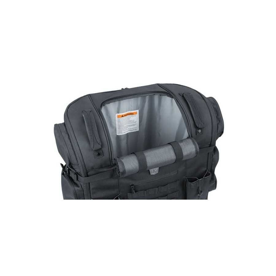 Parfait pour le siège passager de la plupart des motos de tourisme, VTT, UTV ou automobiles. Tenir les animaux jusqu'à 35 lb. (15,8 kg). Fabriqué à partir d'un matériau textile durable de 1200 deniers résistant aux UV et aux intempéries. Structure de support interne rigide pour la sécurité, la durabilité et la longévité. L'ouverture frontale à glissière se replie complètement pour faciliter le chargement/déchargement du chiot sur le vélo. Le système de laisse réglable interne maintient le chien/animal en sécurité lorsqu'il est dans le sac. Des anneaux en D en métal et une variété de sangles réglables offrent un montage sûr et sécurisé. Le grand évent supérieur intégré assure la circulation de l'air et réduit la chaleur sans compromettre la stabilité. Le tout nouvel intérieur gris clair réduit la chaleur et améliore la visibilité intérieure par faible luminosité. - Avec bol de voyage pliable pour la nourriture/l'eau. - Poches biberons externes intégrées orientées vers le pilote (2). - Plusieurs points de fixation modulaires MOLLE pour les fournitures pour animaux de compagnie, les outils ou le coussin de dossier amovible Kuryakyn (MCS 567597 vendu séparément). - Dimensions (environ) : 22" de large x 12" de profondeur x 18,5" de haut. - Capacité interne (environ) : 4 752 Cui (environ 78 litres).