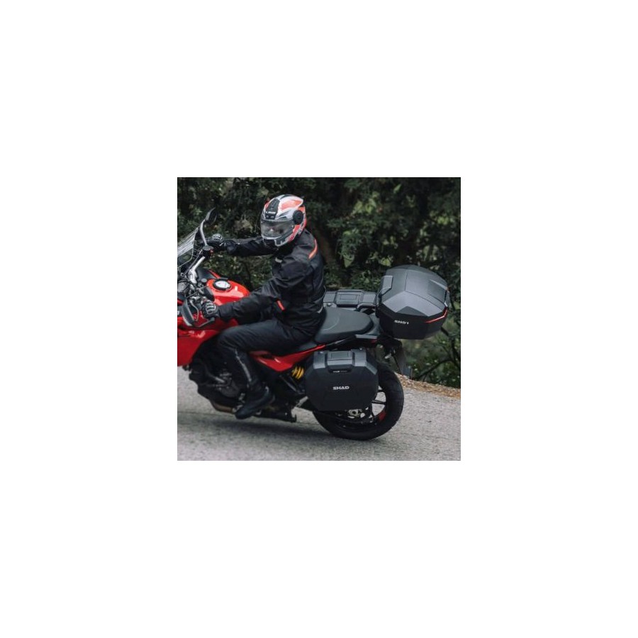 SHAD enrichit sa gamme de systèmes de rangement avec le nouveau top case SH51, conçu pour les motards recherchant une capacité de chargement et une fonctionnalité accrues pour les trajets de moyenne et longue distance. Ce nouveau top case s'intègre parfaitement aux valises latérales extensibles SH38X, formant un ensemble équilibré et polyvalent, idéal pour les longs voyages et offrant une capacité de chargement élevée.