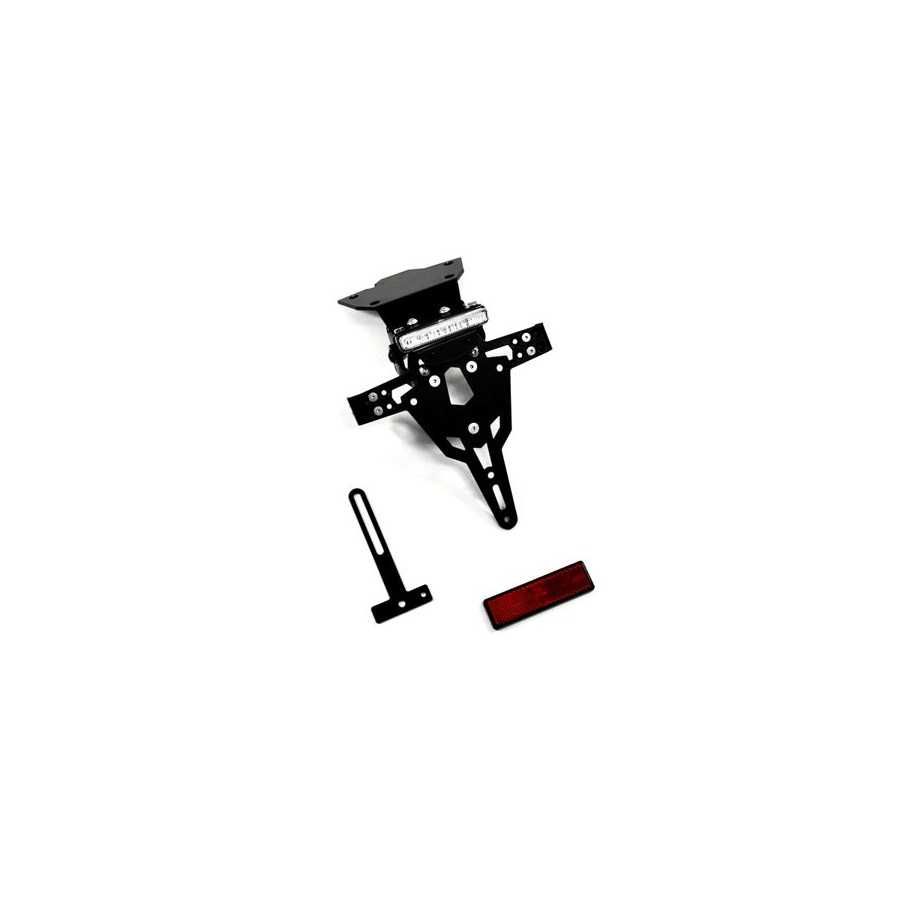 Support de plaque d'immatriculation enduit de poudre noire qui permet une installation sans apporter de modifications aux pièces du carénage. Avec éclairage LED pour plaque d'immatriculation (approuvé ECE)