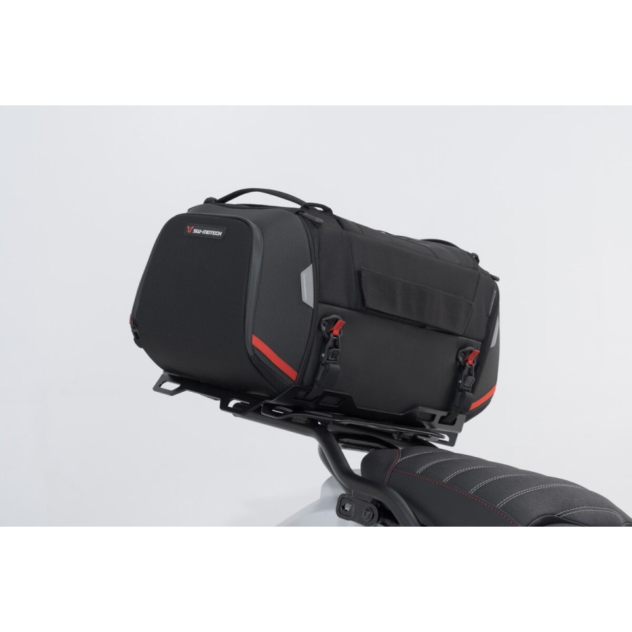 SW-MOTECH fabrique la sacoche arrière de la série PRO en nylon balistique 1680D ultra-résistant et le porte-bagages en alliage d'aluminium robuste. Le porte-bagages se fixe aux points de fixation spécifiques et renforcés de la moto.